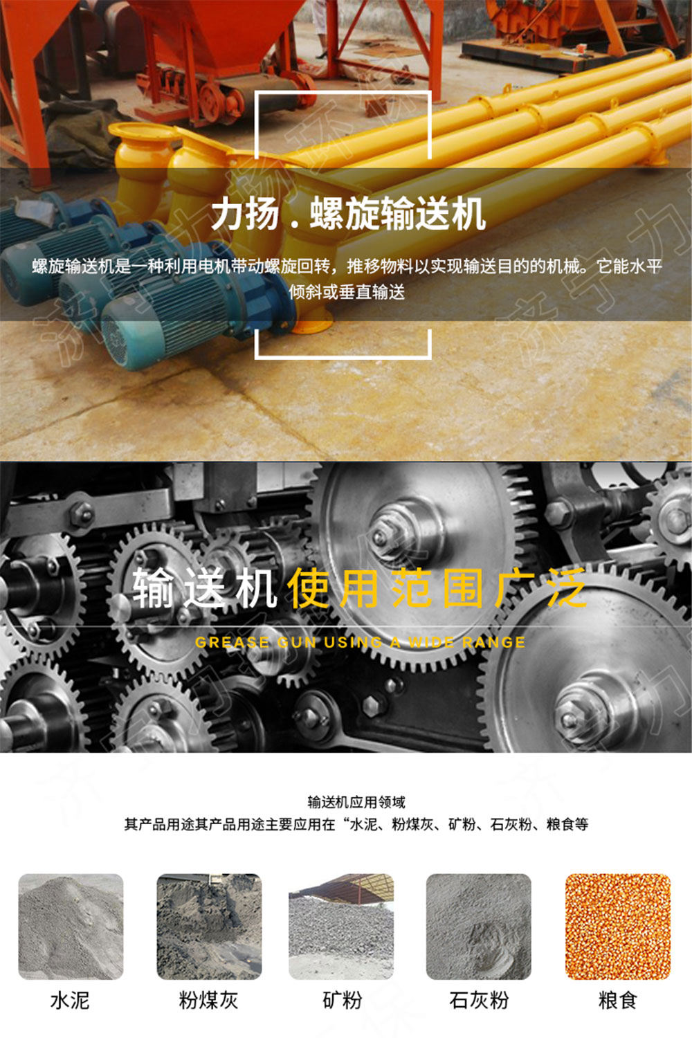 其產(chǎn)品用途其產(chǎn)品用途主要應(yīng)用在“水泥、粉煤灰、礦粉、石灰粉、糧食等”無粘性的物料的輸送。結(jié)構(gòu)簡(jiǎn)單、橫截面尺寸小、密封性好、工作可靠、制造成本低,便于中間裝料和卸料,輸送方向可逆向,也可同時(shí)向相反兩個(gè)方向輸送。輸送過程中還可對(duì)物料進(jìn)行攪拌、混合等作業(yè)。