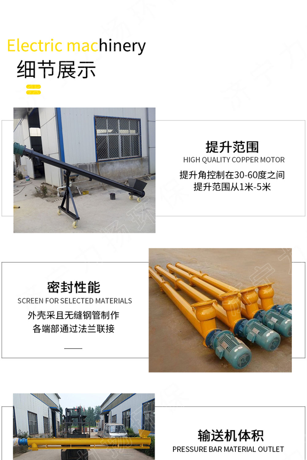 4、螺旋輸送機(jī)體積小、轉(zhuǎn)速高、變螺距、確保快速均勻輸送。一次成型葉片,沒有焊點(diǎn),減少物料輸送中被壓縮程度。