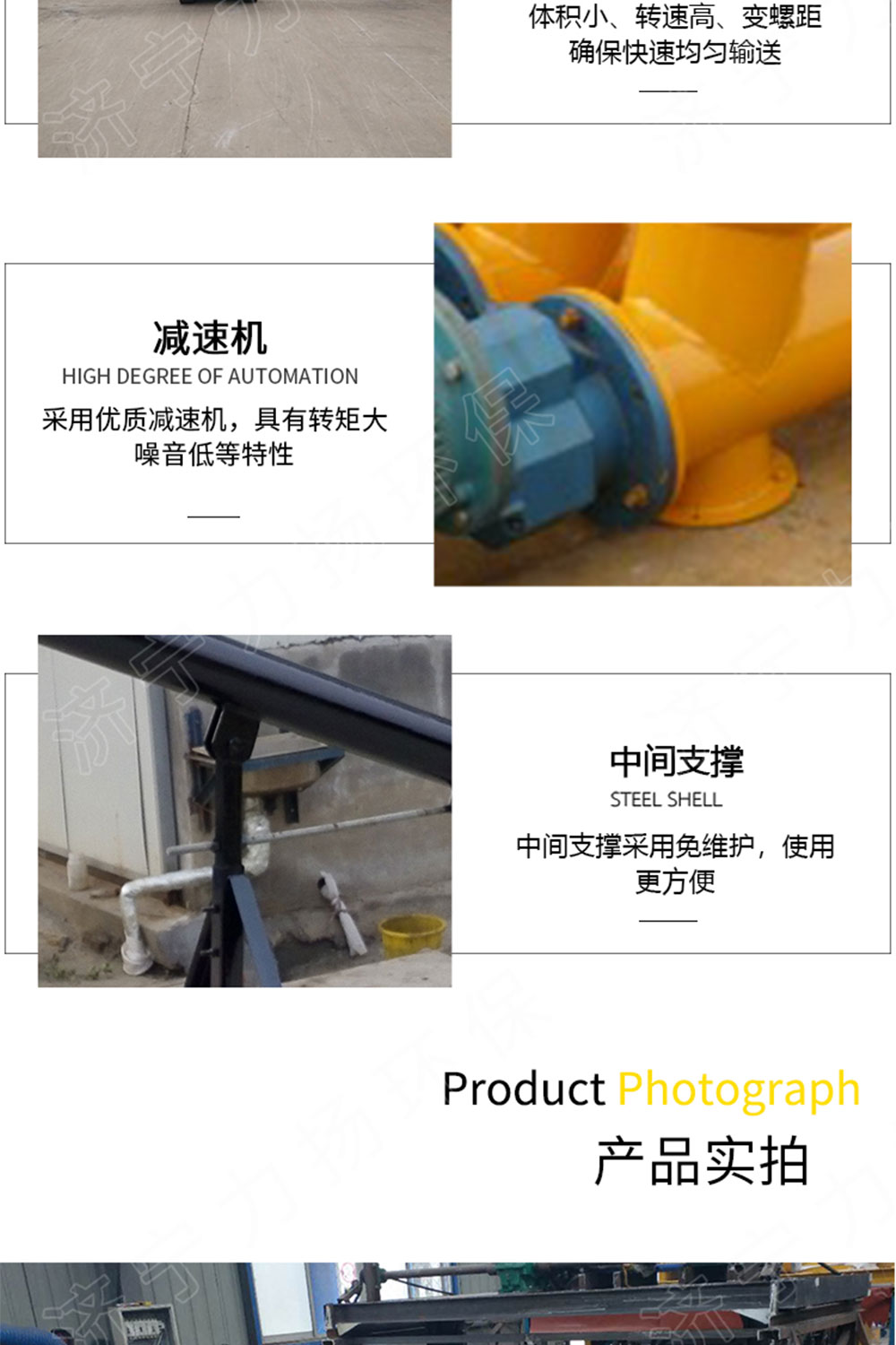 6、是由減速電機(jī)裝置與外殼管,螺旋總成依次相邊,結(jié)合成一臺(tái)整套設(shè)備,移動(dòng)、拆裝十分方便。