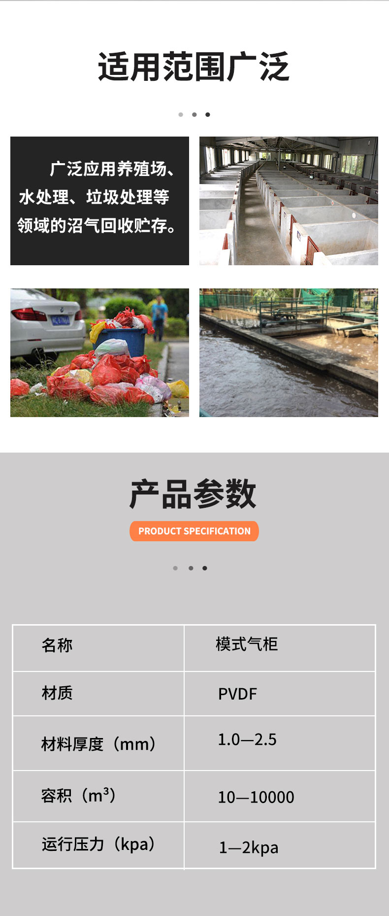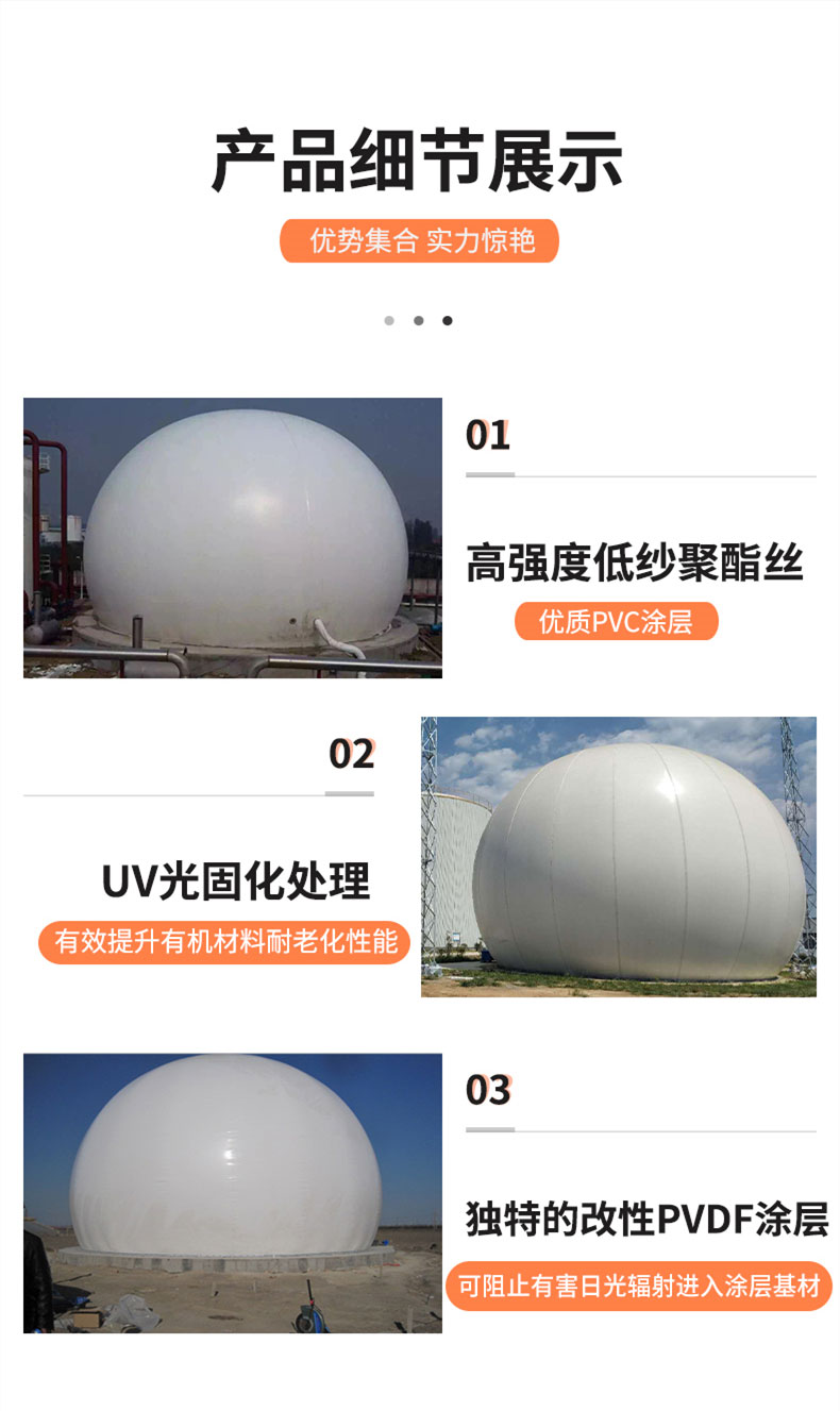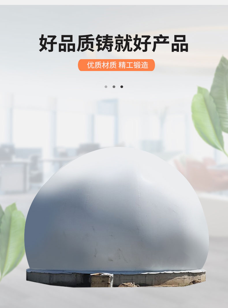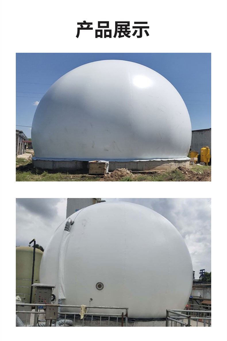 雙膜氣柜外型為3/4球體,由鋼軌固定于水泥基座或厭氧罐罐頂上。主體由特殊加工聚酯材質(zhì)制成,罐體由外膜、內(nèi)膜、底膜(地上柜)及附屬設備組成,具有抗紫外線及各種微生物的能力,高度防火并符合標準。主要用于:天然氣、氧氣、氫氣、沼氣的儲存;該設備具有耐用、結(jié)構(gòu)簡單壓力穩(wěn)定適用范圍廣泛,特別是儲存可燃危險氣體相對安全性高等特點。