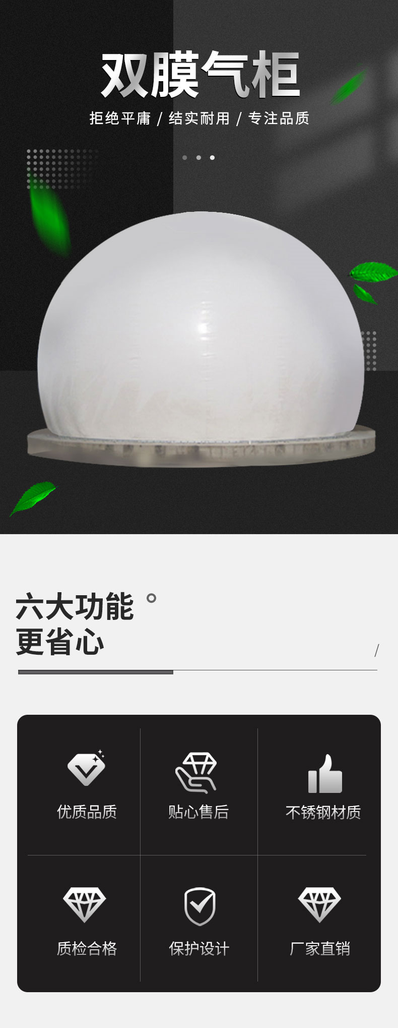 雙膜氣柜主要由外膜、內(nèi)膜和底膜三個部分組成。外膜對系統(tǒng)起保護作用。即使在極端情況下(如暴風雨),外膜也持續(xù)承受著正壓以保證靜壓平衡。內(nèi)膜用于儲存沼氣,并根據(jù)儲氣量膨脹或縮小。底膜用于隔開基礎(chǔ)和內(nèi)外膜。外膜采用雙面PVDF沼氣專用膜材,具有防紫外、耐老化、耐磨性,抗甲烷滲透性能,具有一定的自潔性能。內(nèi)膜及底膜采用雙面PVDF沼氣專用膜材,具有耐老化、耐磨、耐折疊性,抗甲烷滲透性能。內(nèi)膜與底膜之間形成一個容量可變的氣密空間用作。