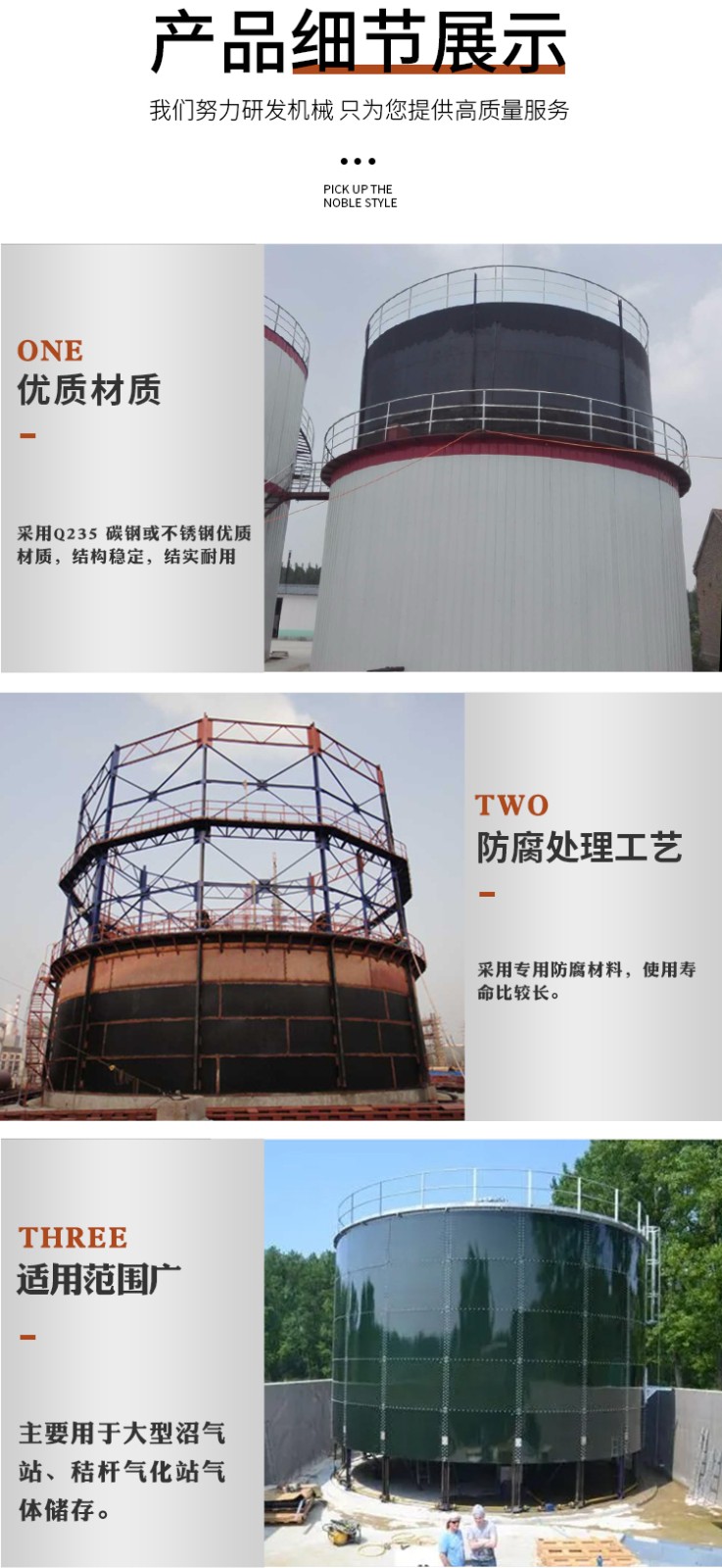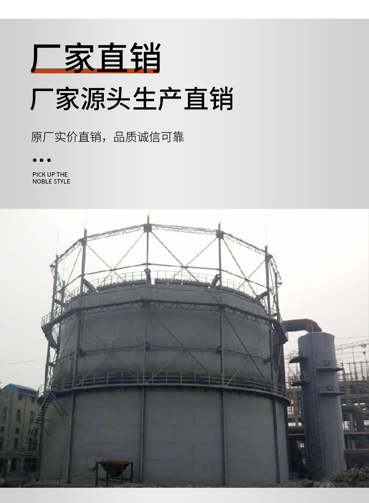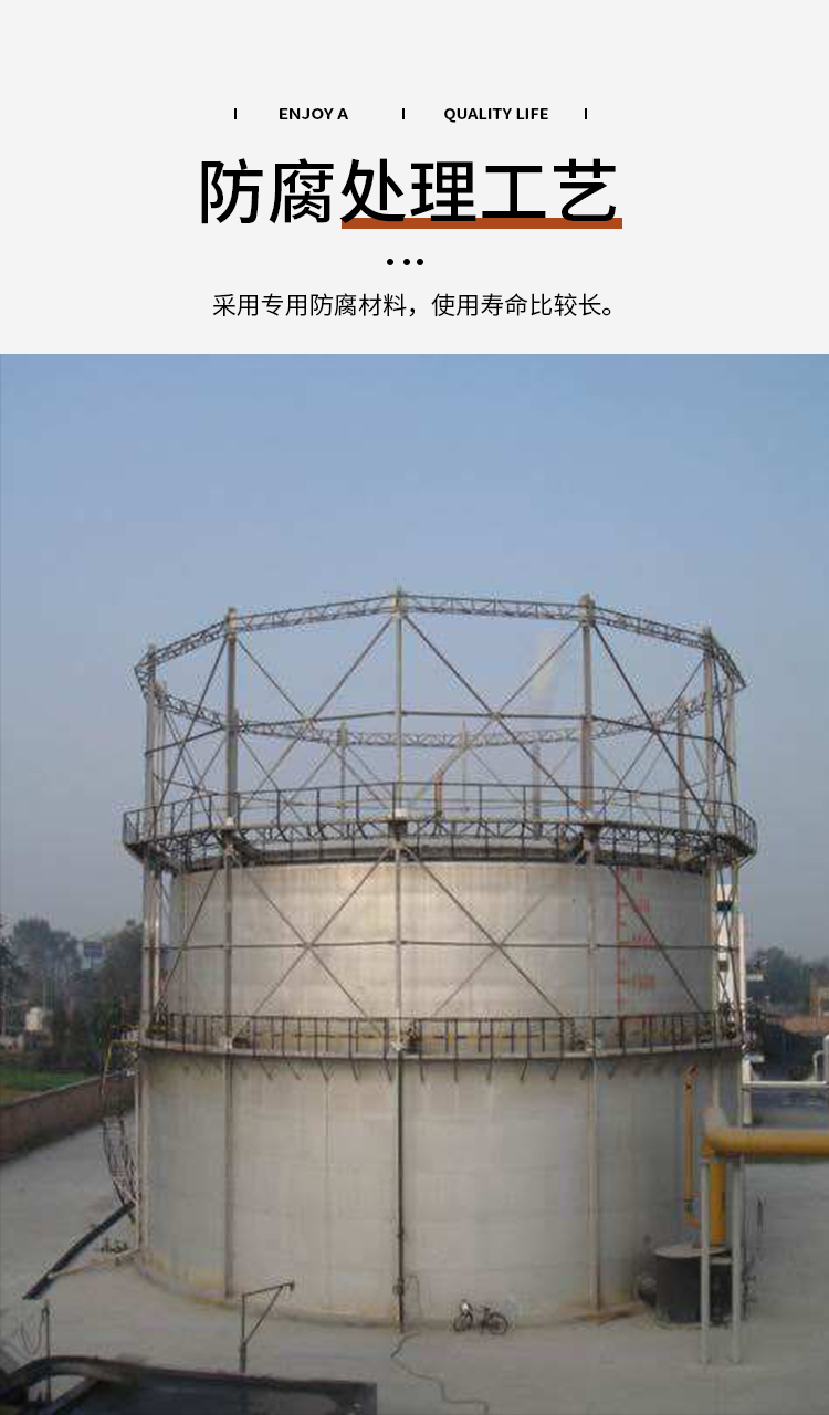 濕式氣柜鐘罩是一個有拱頂?shù)牡酌娉ㄩ_的圓筒形結(jié)構(gòu),在水槽和鐘罩之間是水密封。氣體管道穿過水槽底板和水槽中的水進(jìn)入鐘罩,實現(xiàn)氣體的輸入或排出。當(dāng)向氣柜壓送氣體時,鐘罩上升;在輸出氣體時,鐘罩下降。鐘罩及水槽依靠導(dǎo)軌和導(dǎo)輪保證升降平穩(wěn)。鐘罩和水槽之間,利用水將柜內(nèi)沼氣與大氣隔絕。因此,隨鐘罩升降,沼氣的儲存容積和壓力是變化著的。