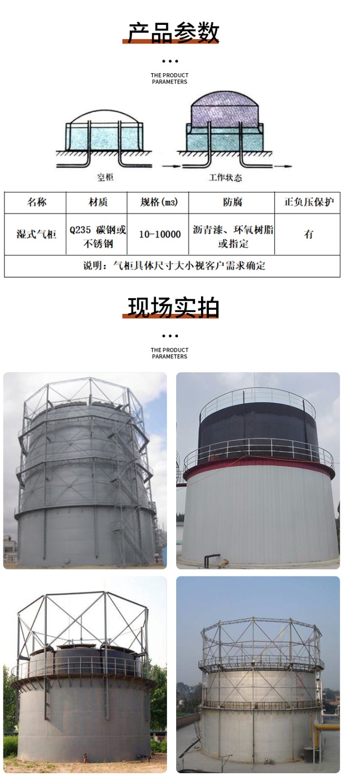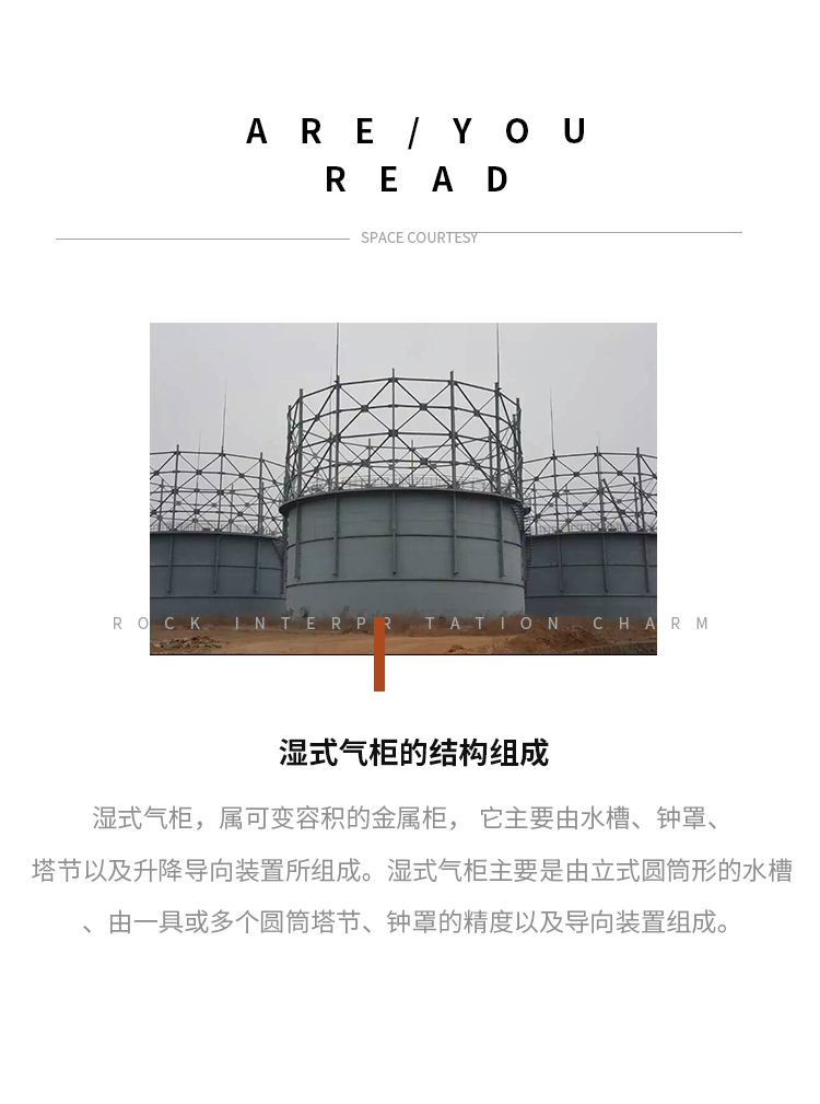 濕式氣柜,屬可變?nèi)莘e的金屬柜,它主要由水槽、鐘罩、塔節(jié)以及升降導(dǎo)向裝置所組成。濕式氣柜主要是由立式圓筒形的水槽、由一具或多個圓筒塔節(jié)、鐘罩的精度以及導(dǎo)向裝置組成。、